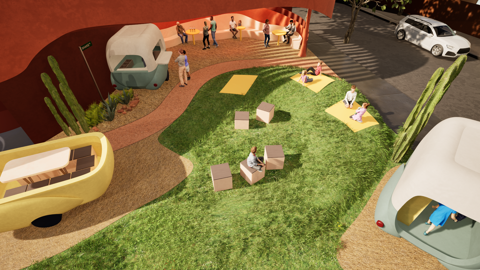 twinmotion exploded axonometric showing the different levels and experiences that the space has to offer. To the back is the indoor arcade and outside is the cafe, seating, and various areas to sit and play boardgames.